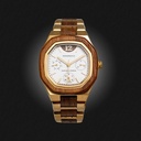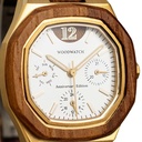 Aurea is made of Teak wood and brushed gold metal, featuring a white dial.