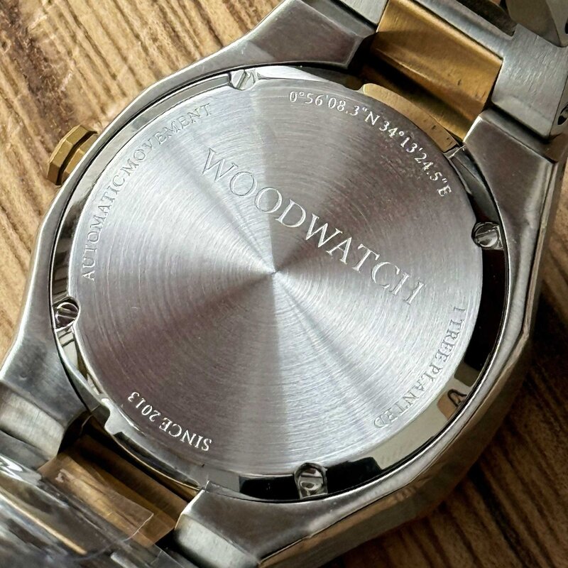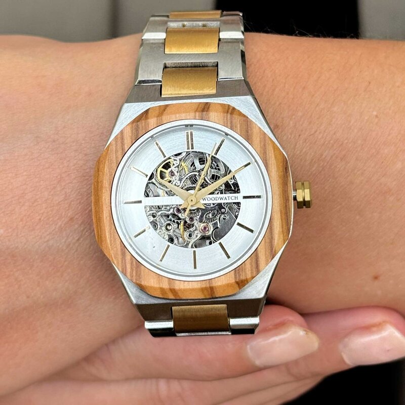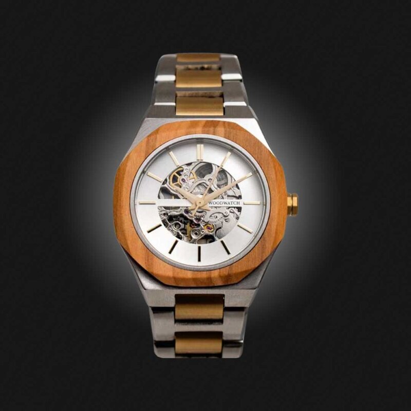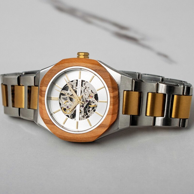 Nova is made of Olive Wood and brushed gold stainless steel.