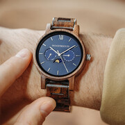 The CLASSIC Collection rethinks the aesthetic of a WoodWatch in a sophisticated way. The slim cases give a classy impression while featuring a unique a moonphase movement and two extra subdials featuring a week and month display. The CLASSIC Sailor is made of East African Kosso Wood and features a blue dial and golden-colored details.