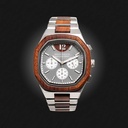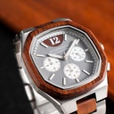 Terra is made of Padauk wood and brushed silver metal, featuring a silver dial.
