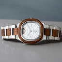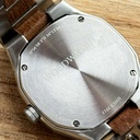 Thara is made of Teak wood and brushed silver metal, featuring a white dial.